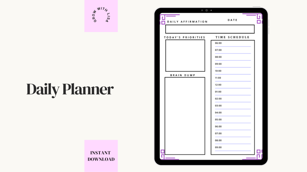 You'll receive a vibrant, contemporary daily planner to keep track of your ambitions, schedule, ideas, top priorities, and daily affirmation. You can use this printable to support your daily goal-achieving.